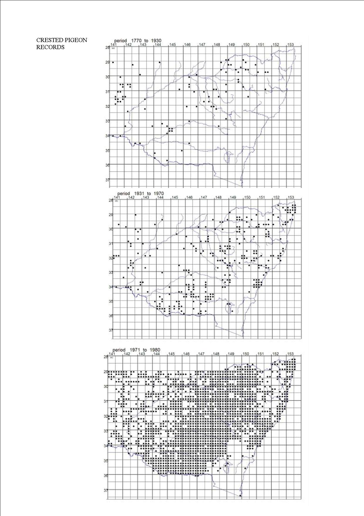 The data is referenced by Latitude and Longitude usually by 10 minute grids. From the data it is possible to see changes over time (see attached Maps for the Crested Pigeon (043) and for the Superb Parrot (277) which shows seasonal variation).