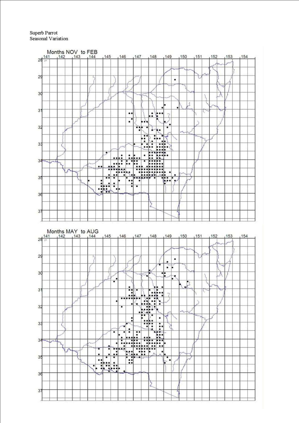 The data is referenced by Latitude and Longitude usually by 10 minute grids. From the data it is possible to see changes over time (see attached Maps for the Crested Pigeon (043) and for the Superb Parrot (277) which shows seasonal variation).